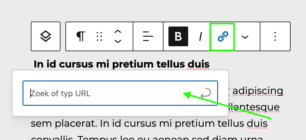 Nu verschijnt er boven de tekst een zwevende balk. In deze balk zie je een link icoontje staan. Als je daar op klikt, komt er een popup tevoorschijn waar jij de gewenste link kunt ingeven.